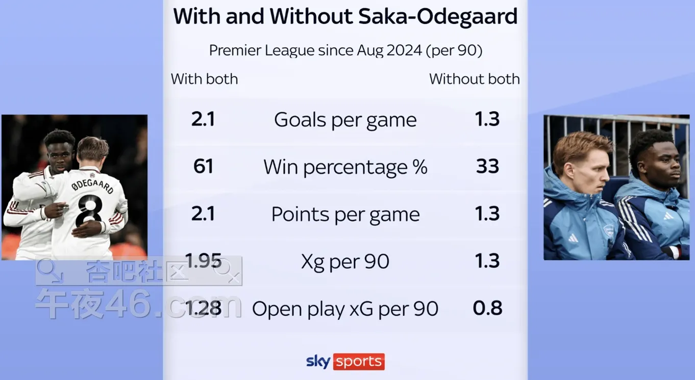 <p style="text-align: start; font-size: 16px;">04月18日讯 超争冠关键战即将打响,阿森纳本轮将客场挑战曼城。赛前伤情方面,阿尔特塔已经确认,萨卡因伤无缘本场比赛;至于厄德高,主帅并未确认其能够出战,目前仍在评估范围内,外界普遍将其视为本场的主要疑问人选之一。</p><p style="text-align: start; font-size: 16px;">在这样的背景下,天空体育也晒出了一组阿森纳在“同时拥有萨卡和厄德高”与“两人同时缺阵”时的英超数据对比,统计范围为自2024年8月以来的英超场均数据。图中显示,当萨卡和厄德高同时在阵时,阿森纳场均打进2.1球,胜率达到61%,场均拿到2.1分,场均预期进球(xG)为1.95,场均运动战预期进球为1.28。而在两人都不在的情况下,阿森纳场均进球下降到1.3球,胜率只有33%,场均积分也降至1.3分,场均xG跌至1.3,场均运动战xG则只有0.8。</p>