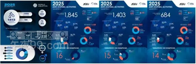 此外,从2025年第二季度起,世界泳联在公布反兴奋剂数据时首次加入治疗用药豁免(TUE)申请数量统计。数据显示,第二季度收到16份申请,第三季度15份,第四季度14份。治疗用药豁免制度允许运动员在医生监督下使用部分被列入禁用清单的药物,用于治疗疾病,例如部分治疗急性疾病的感冒药或用于治疗哮喘等慢性疾病的药物。